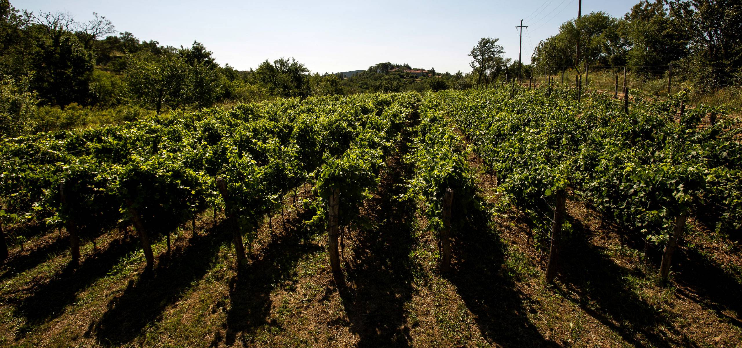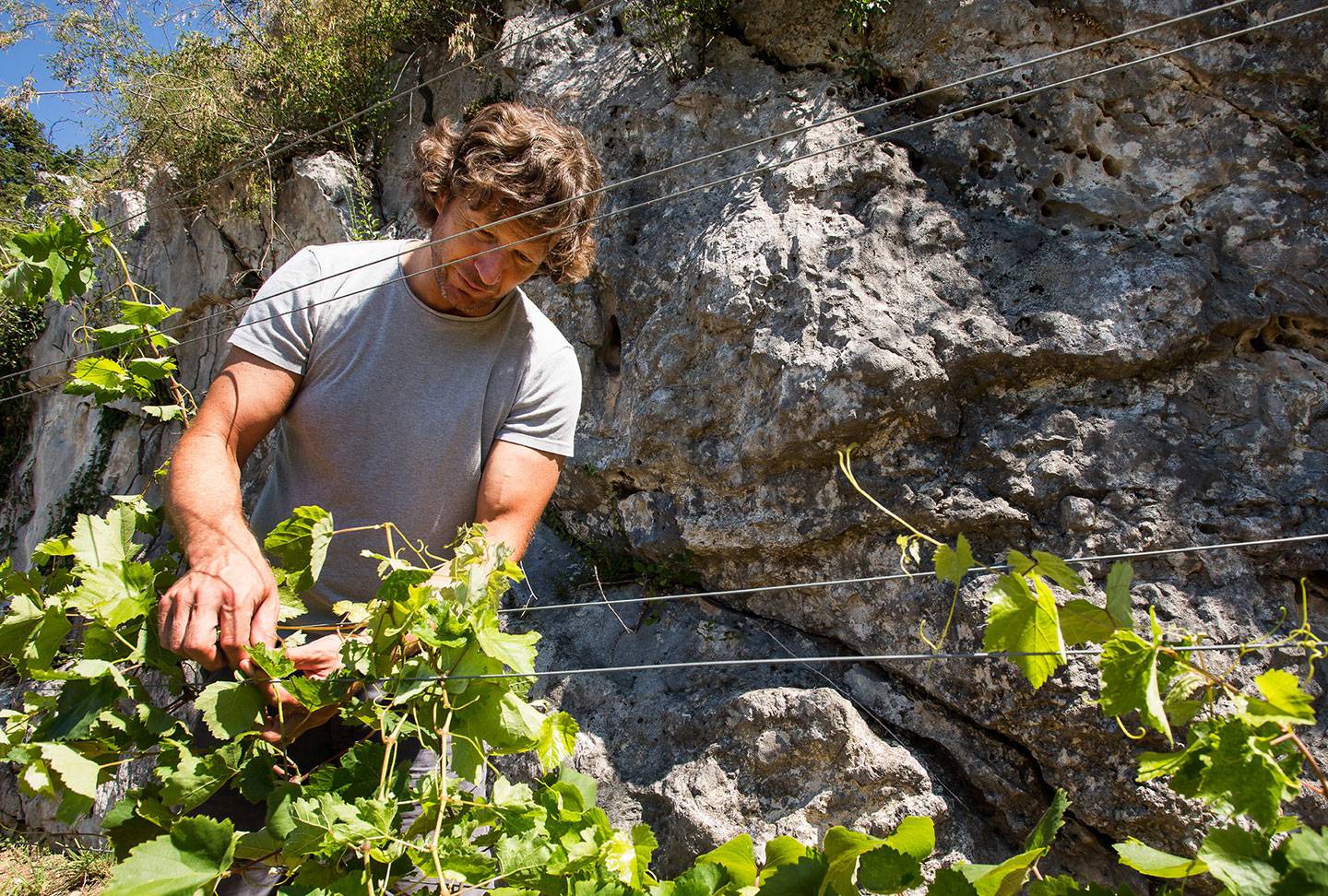 Il sistema di allevamento delle viti che ho scelto di sviluppare è quello ad alberello con potatura corta a tre speroni. Le viti hanno oggi una media di 30 anni, le più vecchie risalgono al 1960. Le vigne sono esposte a sud, affacciate al mare. I venti che qui imperversano, la brezza marina, la bora e la tramontana, asciugano costantemente l’umidità e spazzano via le impurità. I rari trattamenti che eseguiamo sono a base di rame, zolfo e infusi vegetali. Nel vigneto sul ciglione carsico, a picco sul mare, non si effettua praticamente nessun trattamento.